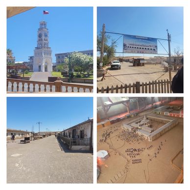TRAVELLED ABOUT 45 MINUTES TO THE GHOST TOWN OF HUMBERSTONE, ONCE A THRIVING SODIUM NITRATE MINING TOWN FOR 100 YEARS, TILL IT WAS ABANDONED IN 1960. IN DECEMBER 1903 THERE WAS A REVOLT OF THE WORKERS FOR BETTER CONDITIONS. THIS RESULTED IN THE GOVERNMENT SENDING AN ARMY THAT LED TO A MASSACRE OF OVER 2000 MEN, WOMEN AND CHILDREN.